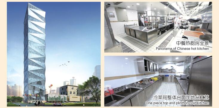内全套厨房设备供应及配套装饰工程,包含加工中心、全日制餐厅、中餐厨房、宴会厨房、天空吧等。